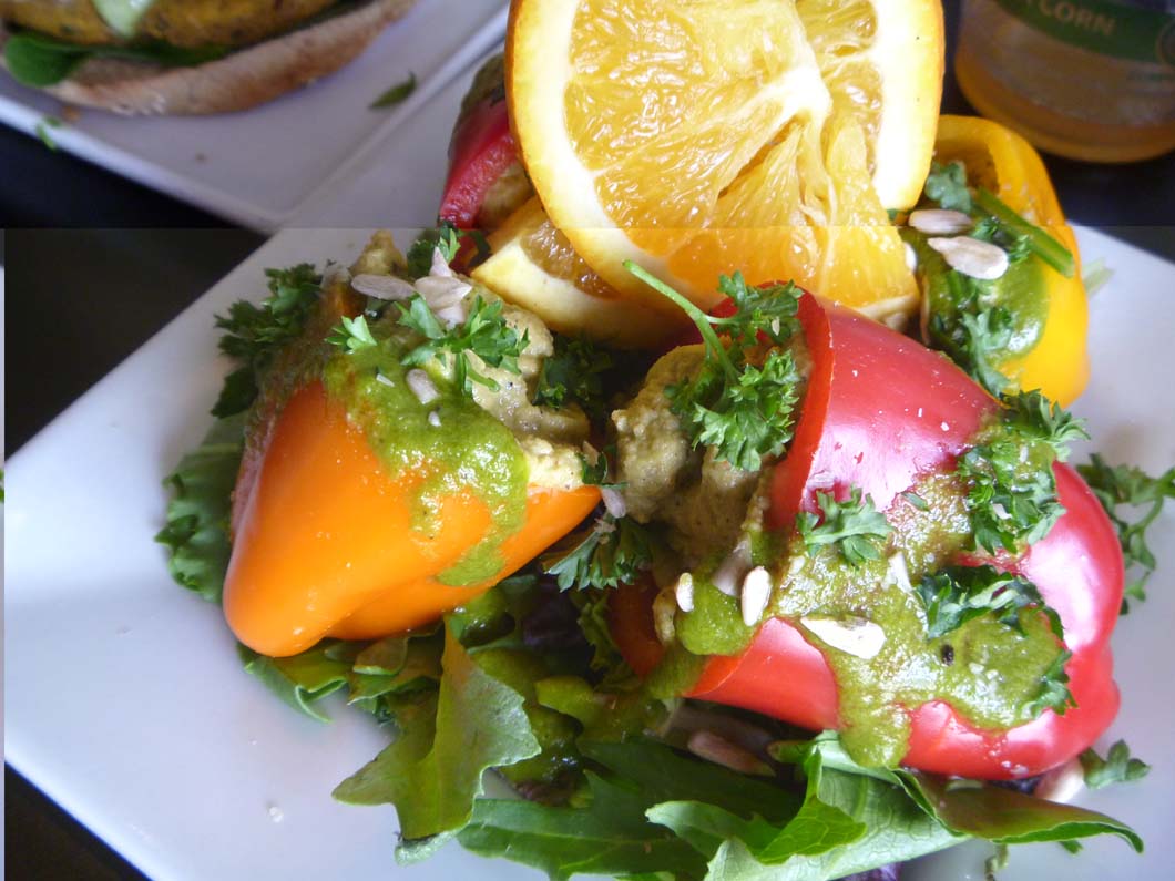 The wait was a little long, and that could have been for several different reasons, but once the food came, we were not disappointed. The Raw Jalapeno Poppers looked exquisite. Almond cheese stuffed into baby bell peppers, laid out on a bed of mixed greens, with what looked like a bit of cilantro pesto. Then there was the Soyrizo Tacos. Soyrizo smothered with avocado puree, purple cabbage, onions and mushrooms, all wrapped up in a warm corn tortilla. An optional side of chips with a pineapple salsa fresca completed the plate. Then came the Roasted Tomato Burger, the ever present LTO, an oat bran bun, served with a refreshing mixed green salad with not only sunflower seeds, but pumpkin seeds as well. I love pepitas!