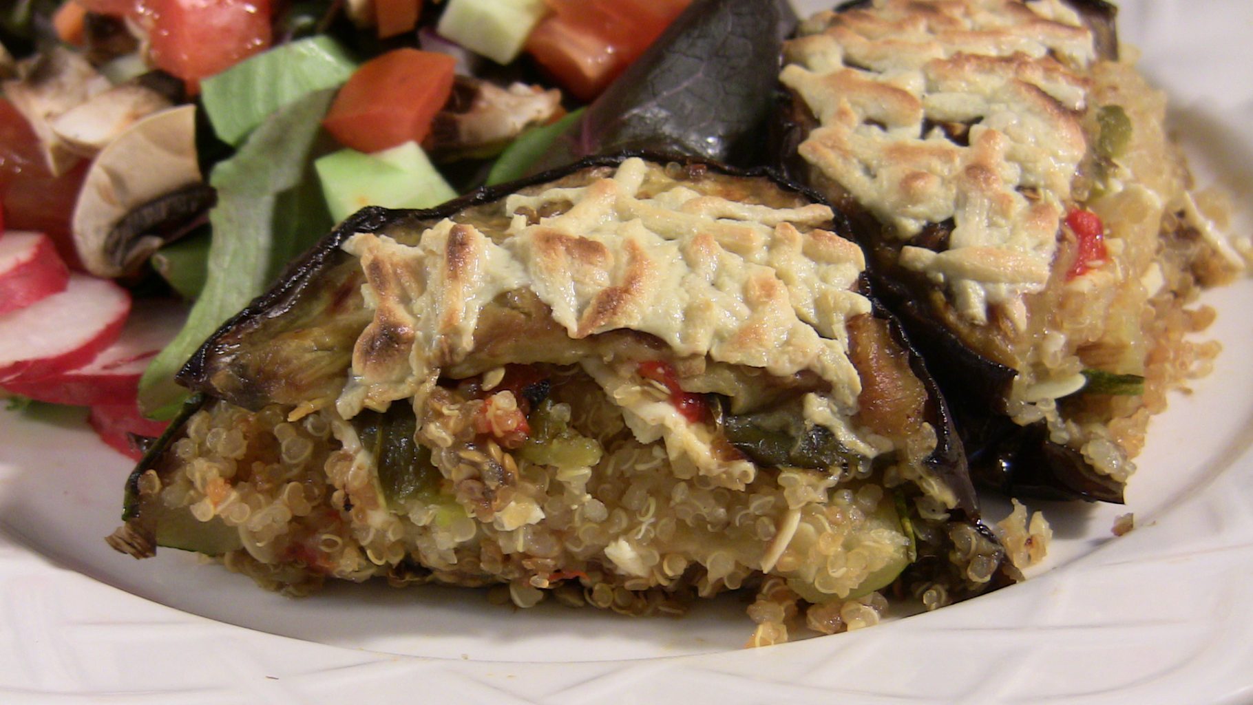 - Use eggplant as the base, then quinoa, then peppers, then the zucchini. I use two slices of eggplants with the squash in the middle.
